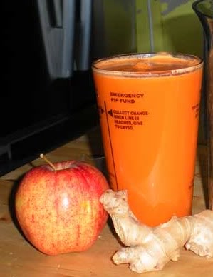 My favorite fresh juiced drink is carrot, apple, ginger with lemon! Yummie.... This is a very popular drink amongst "juicers" and is packed with Vitamin A and C- which is great for the hair, skin and nails. Here is my recipe: